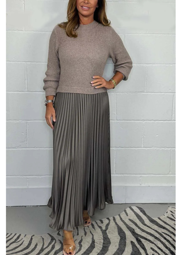 Szukasz stroju, który doskonale łączy komfort i elegancję? Zestaw Isabelle Elegante składa się z wyrafinowanego swetra oraz eleganckiej plisowanej spódnicy, idealnych na chłodniejsze dni. Ten zestaw sprawia, że zawsze wyglądasz stylowo, niezależnie od tego, czy jesteś w drodze, czy spędzasz dzień w domu.