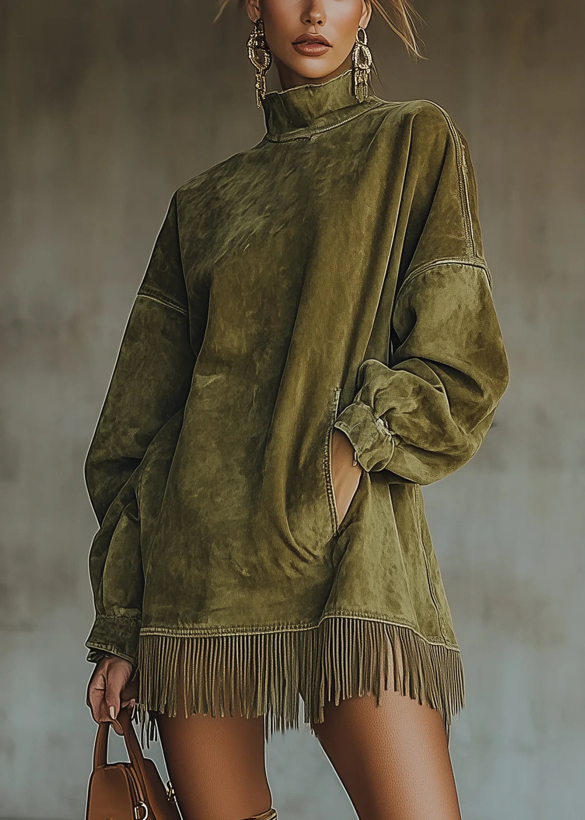 Amali │Sukienka z Zamszu z Wysokim Kołnierzem i Frędzlami