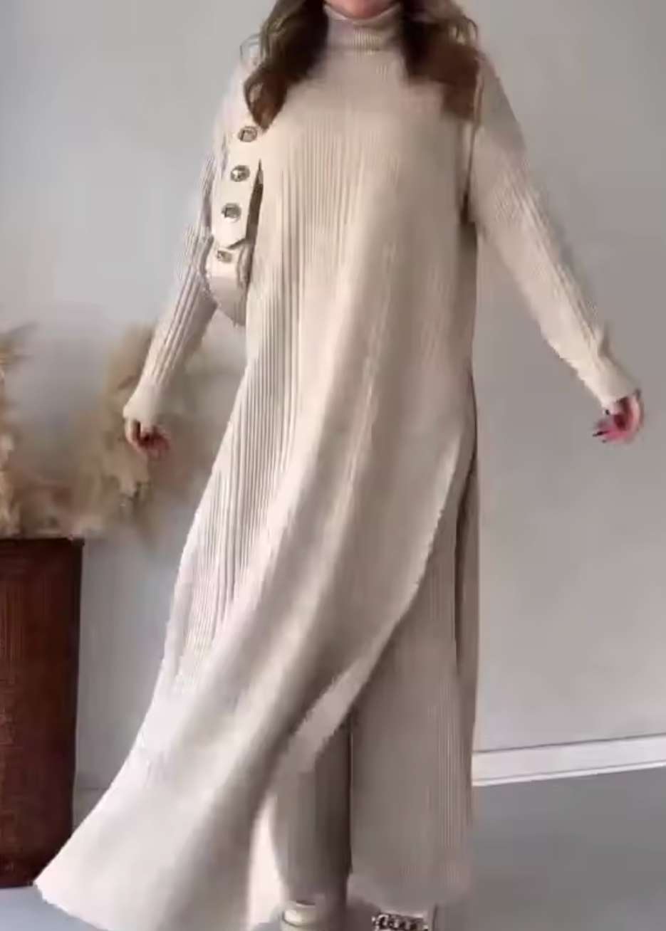 Dzięki dwuczęściowemu kompletowi z gładkiej dzianiny inwestujesz w styl, który przetrwa lata, łącząc w doskonałej harmonii skromność, komfort i nowoczesną elegancję.
