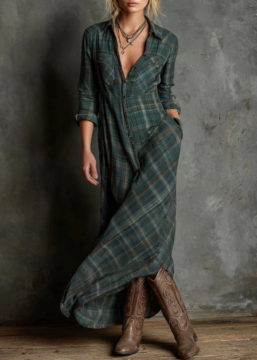 Maxi | Sukienka Maxi w Zieloną Kratę z Kołnierzem z Klapami
