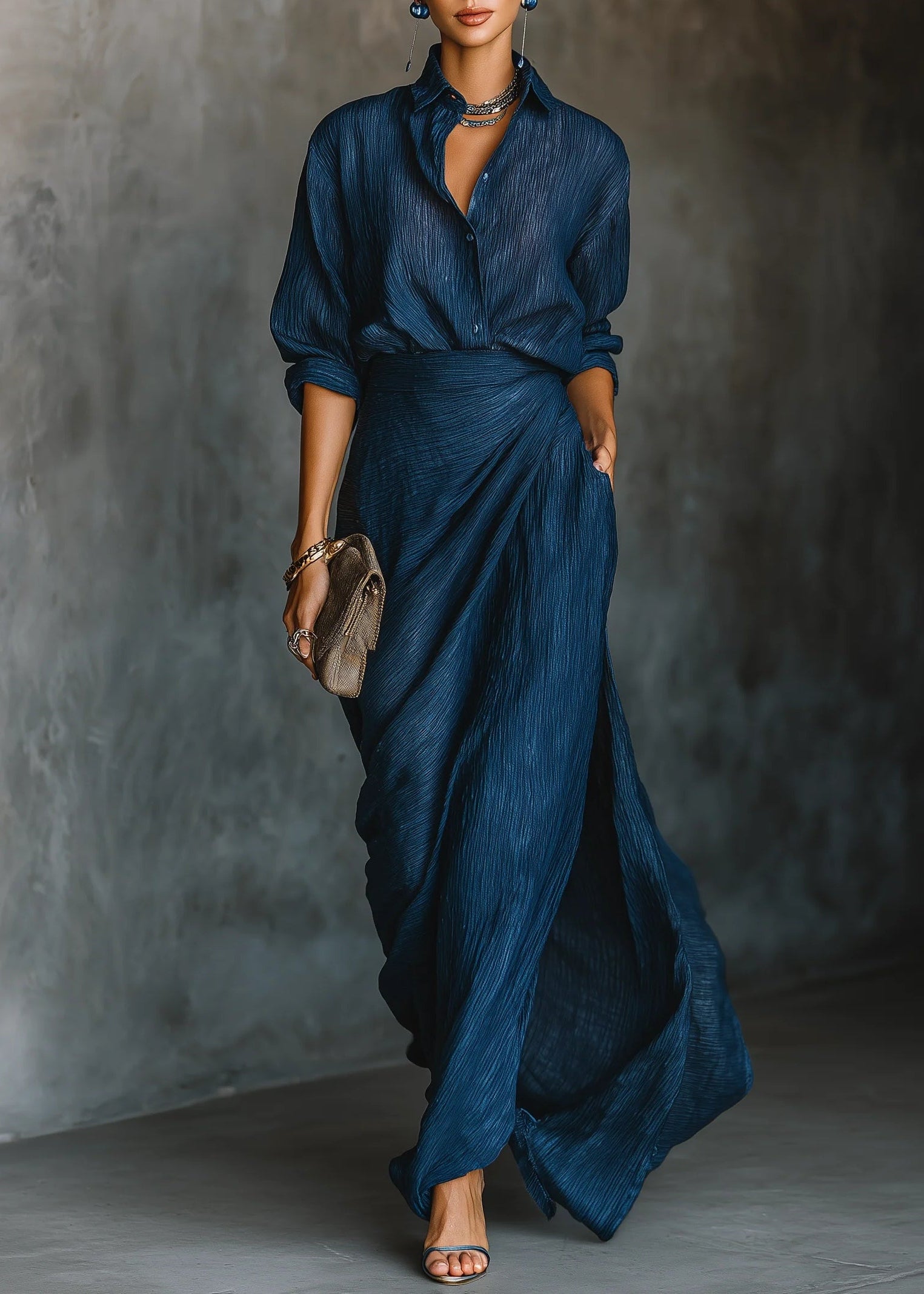 Przedstawiamy Sky: elegancki zestaw koszuli i długiej spódnicy, który podnosi Twój styl. Ten wyrafinowany zestaw cechuje się długą spódnicą i luźnym, swobodnym krojem, zapewniającym maksymalny komfort.