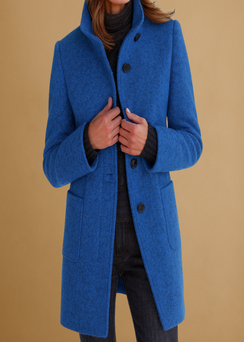 Prosty, lekko dopasowany krój podkreśla sylwetkę, nie opinając jej, a wyrafinowany, stojący kołnierz delikatnie chroni przed zimnem.